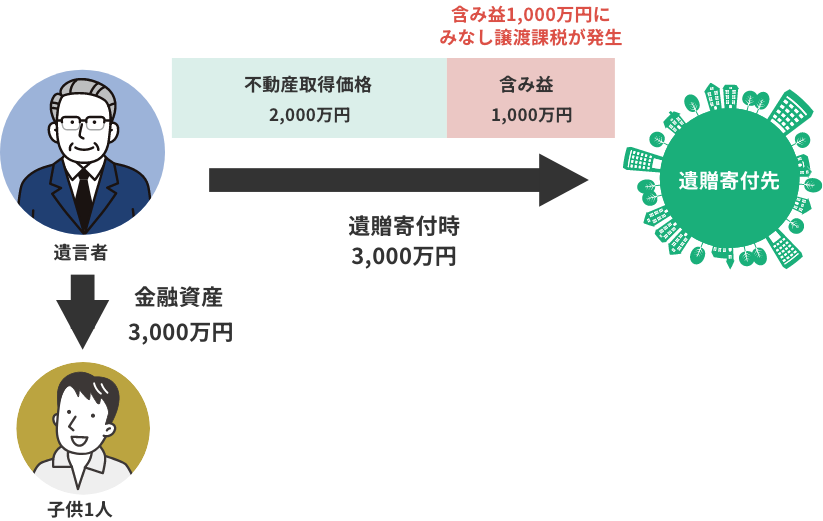 遺贈寄付された不動産・株式に含み益があった場合は含み益に所得税がかかります。この含み益に所得税がかかることを「みなし譲渡所得課税」といい注意が必要です。